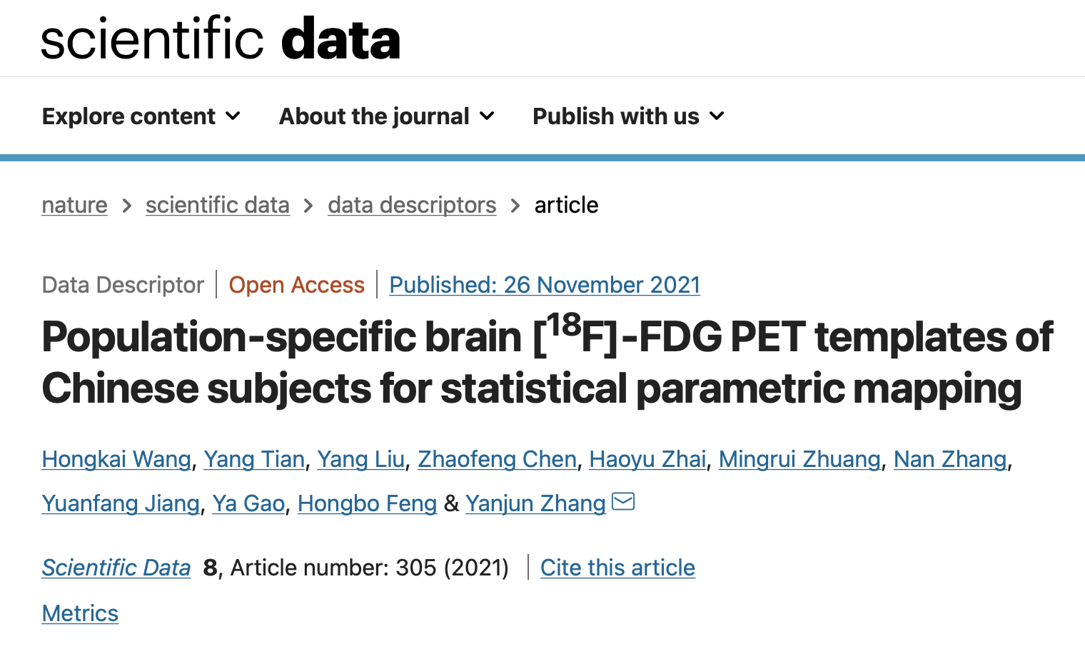 2021年11月,生物医学工程学院王洪凯教授团队研究成果“Population-specific brain [18F]-FDG PET templates of Chinese subjects for statistical parametric mapping”发表在Nature子刊Scientific Data上(https://www.nature.com/articles/s41597-021-01089-1)。该研究基于脑部正电子发射断层成像(简称PET)的临床大数据,经过严格的数据筛选,采用机器学习算法生成中国人群的脑部PET影像平均图谱以及标准差图谱。