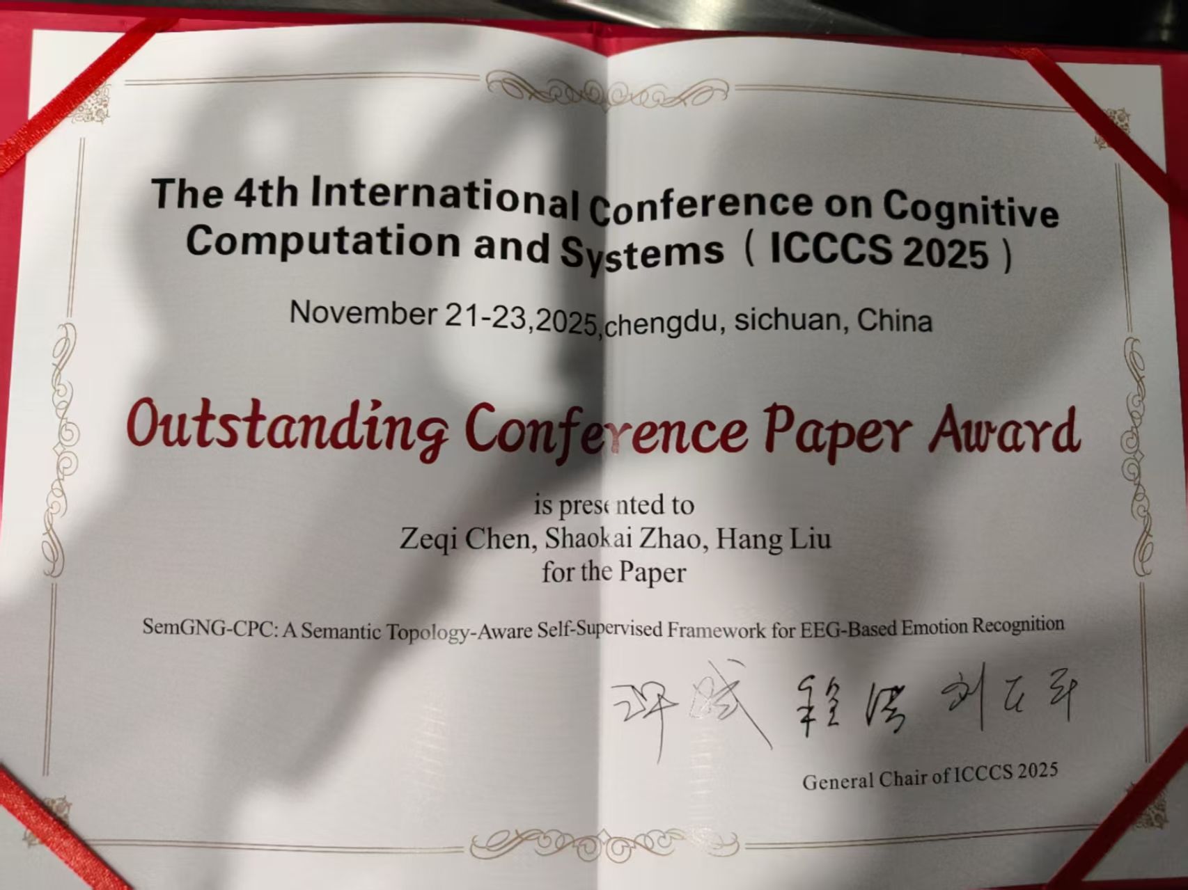 2025年11月21日至23日,第四届认知计算与系统会议(ICCCS 2025)暨《中国科学:信息科学》前沿学术沙龙在成都举行。学院刘航副教授指导的2023级生物医学工程专业研究生陈泽启发表的论文《SemGNG-CPC: A Semantic Topology-Aware Self-Supervised Framework for EEG-Based Emotion Recognition》被录用为大会口头报告论文,并获优秀论文奖。